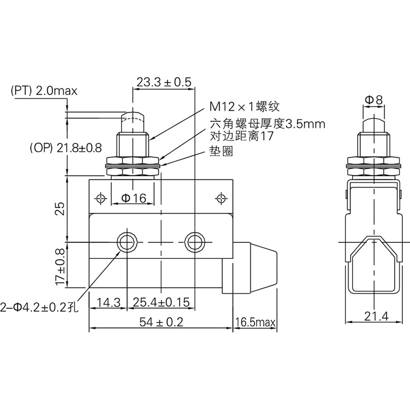 安裝孔間距為25.4mm,與RZ型微動開關相同。